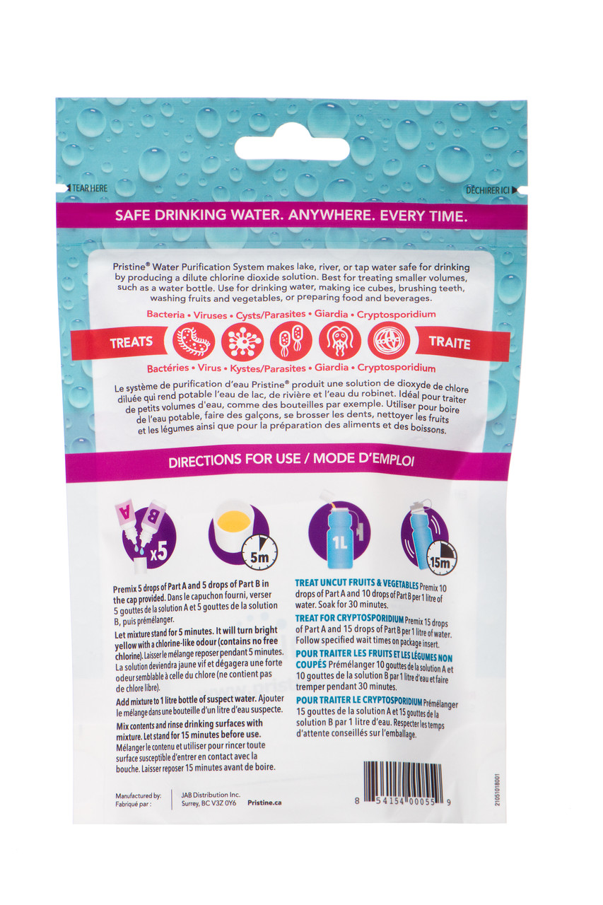 One 30-mL Pristine personal pack will treat up to 120 L of water. A 60-mL pack treats up to 240 L.