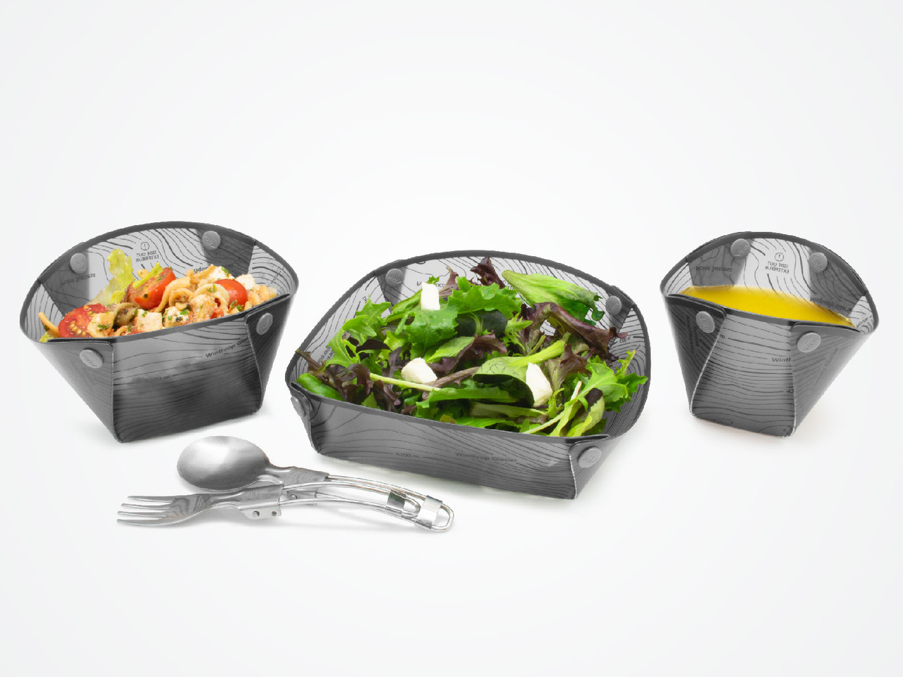 The world's lightest pack flat tableware! Complete three piece set (Cup, Bowl, Dish). Fozzils Solo Pack is the tableware of choice for backpacking, travel, biking, hiking, RV, boating, picnics, mountaineering and even at the office or for pets! Save space and weight, fold and store flat. Convenient measuring lines for food prep, easy clean non-stick surface. A durable, reusable alternative to disposables (BPA free).