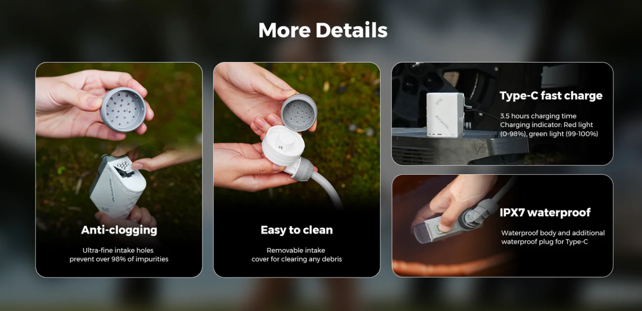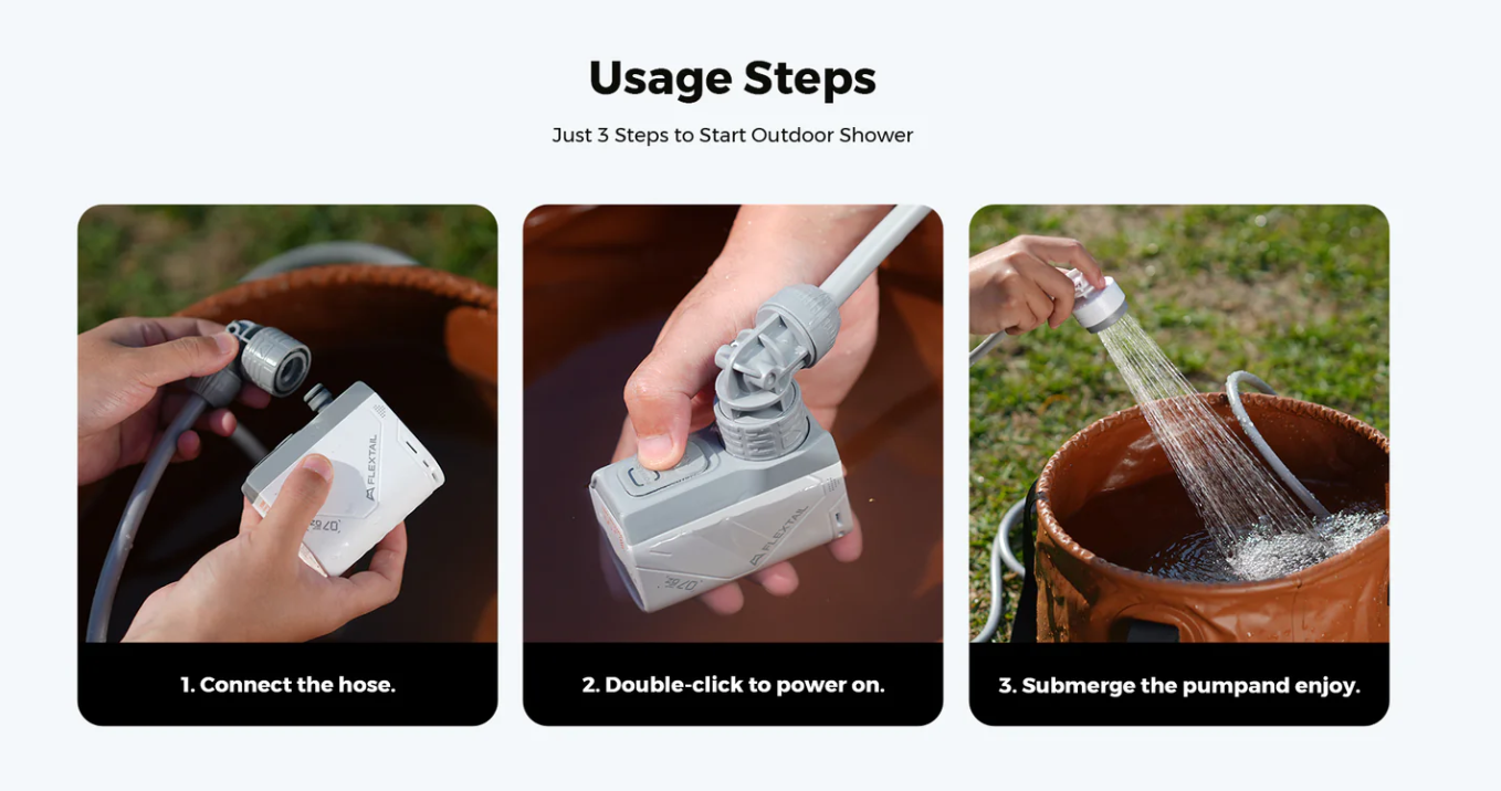 Roughly the size of a credit card and weighing only 7oz, this rechargeable portable shower is changing the outdoor camping game. This energy efficient air pump and showerhead can meet the shower needs of multiple people, delivering long-lasting flow from 35-70 minutes. That's enough for washing 420 coffee cups, 5 showers, or 30 bicycles!
