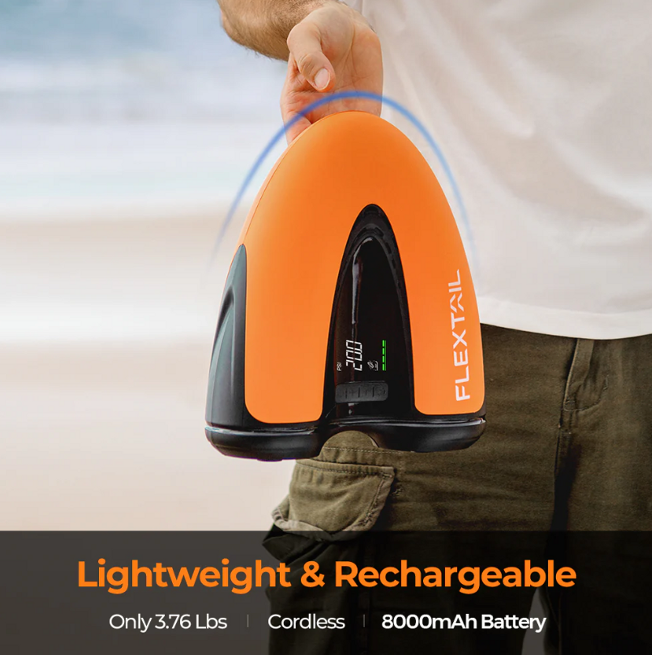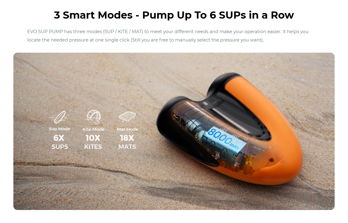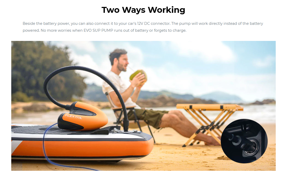 Powered either by its built-in rechargeable 8000mAh battery, or by plugging it into your car's 12V DC connector (using included car connector cable), this portable SUP pump is not only for use on SUPs but as an all-in-one cordless electric pump.