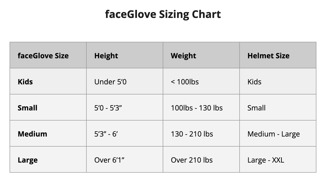 The easiest size reference is to match to the helmet sizing. A person that wears a medium helmet should purchase a medium faceGlove FLEX.