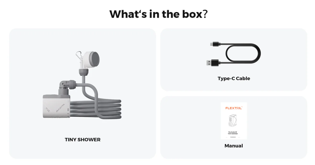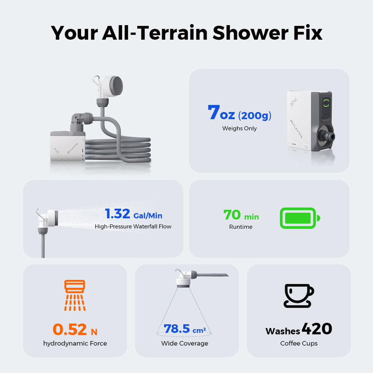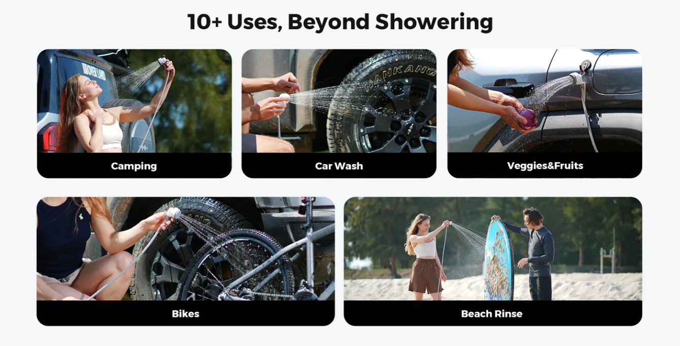 Roughly the size of a credit card and weighing only 7oz, this rechargeable portable shower is changing the outdoor camping game. This energy efficient air pump and showerhead can meet the shower needs of multiple people, delivering long-lasting flow from 35-70 minutes. That's enough for washing 420 coffee cups, 5 showers, or 30 bicycles!
